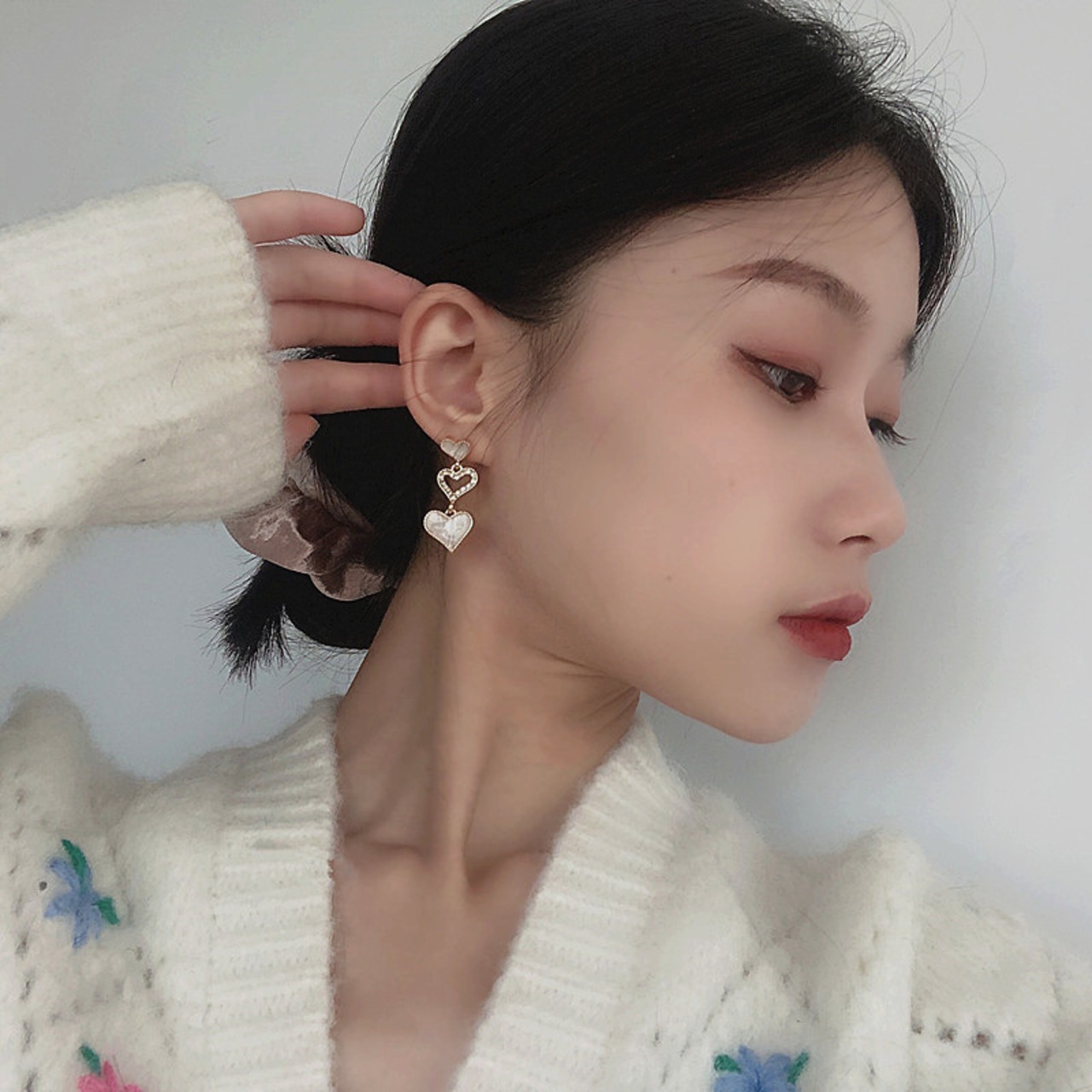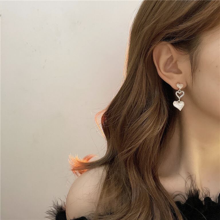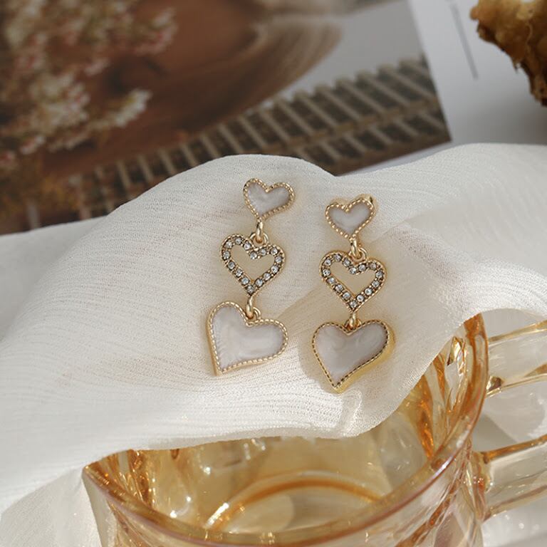 大きさも異なったハートで、真ん中はビジューになっているので、揺れるたびキラキラします。